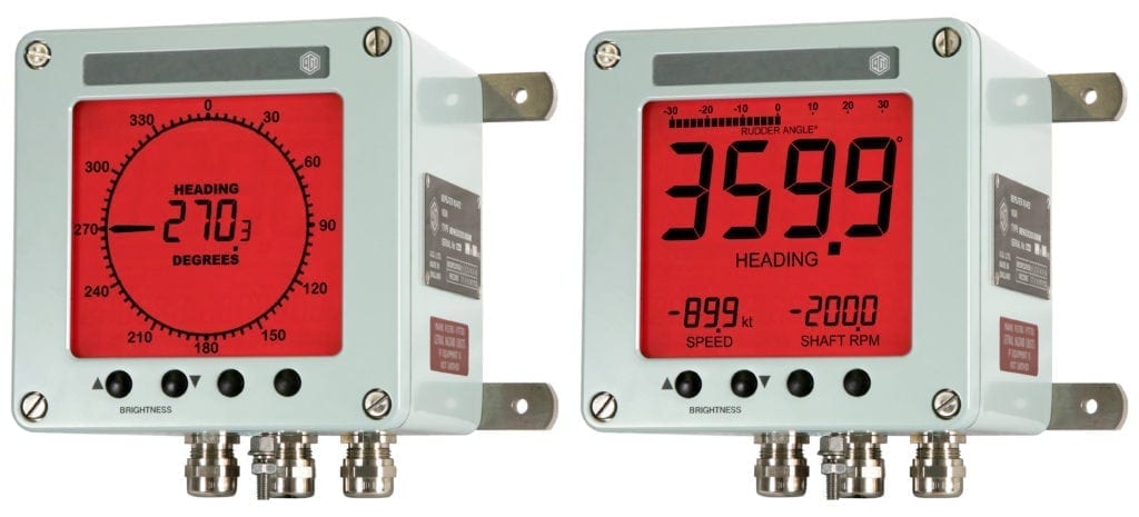 The AGI monochrome LCD repeaters have a fixed single page design available to display a variety of parameters including Ship’s Speed & Distance, Roll, Pitch, Heel, Trim, Heading, Depth, Wind Speed & Direction, Temperature, Humidity and Pressure.