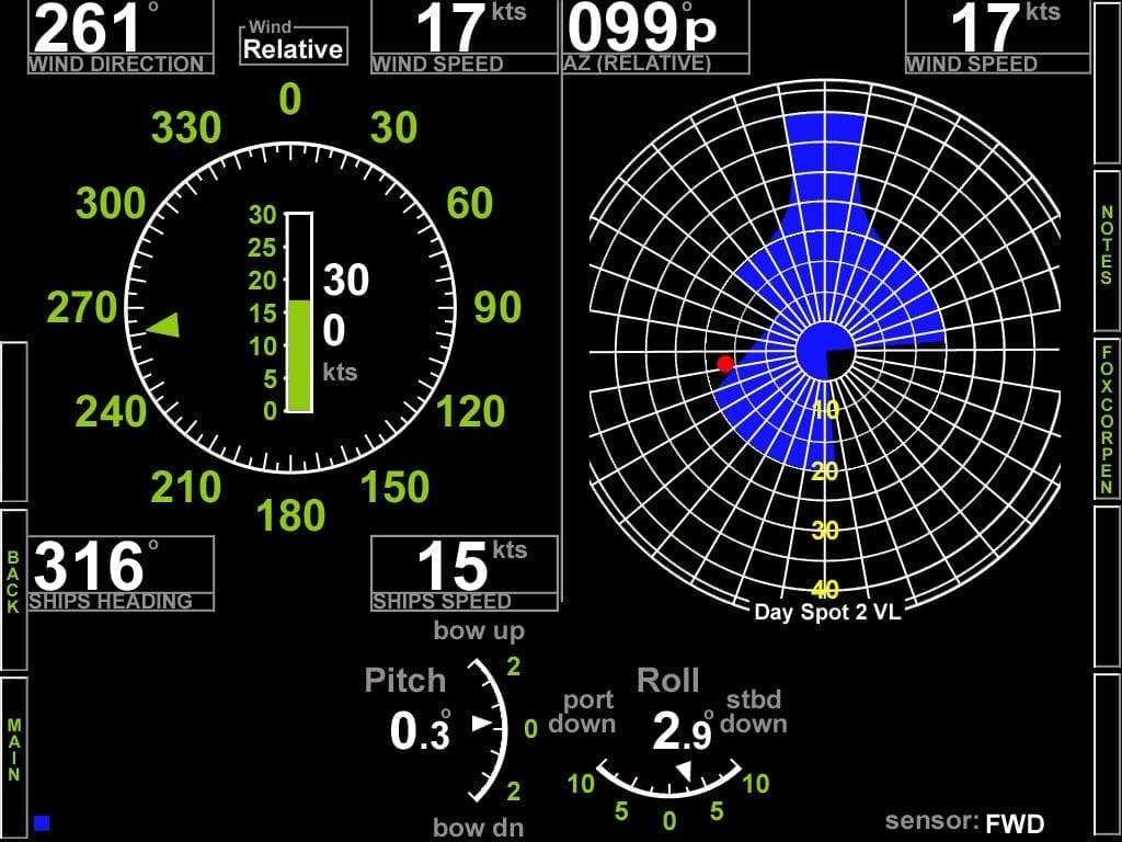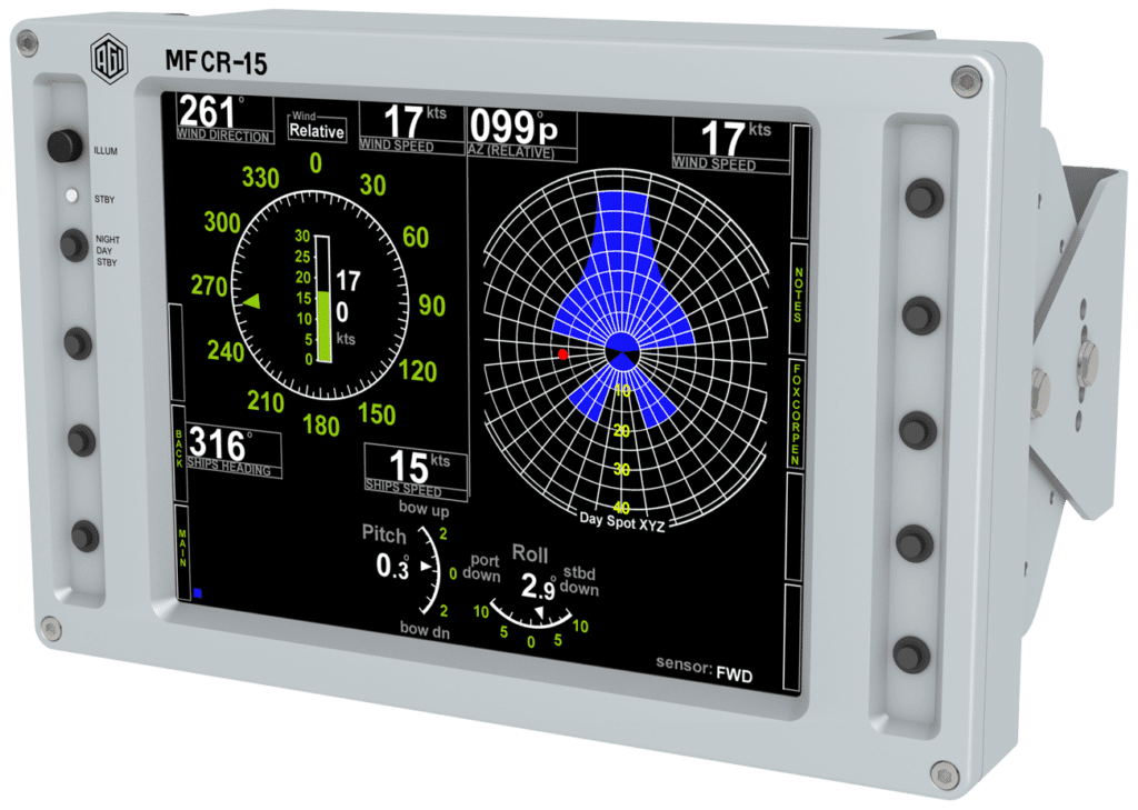 SHOLDS is an extension of AGI’s AGIMET and MORIAH naval meteorological systems that utilises AGI’s proven range of solid state Multi-Function Colour Repeaters (MFCR) along with specially developed software to automate the traditional method of manually plotting relative wind information onto a printed paper Ships Helicopter Operating Limit (SHOL) envelope, therefore minimising the workload on the ship’s crew and keeping manning levels to a minimum.